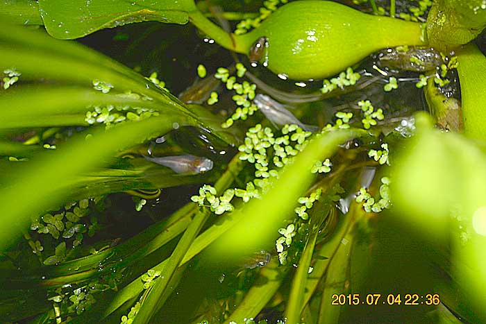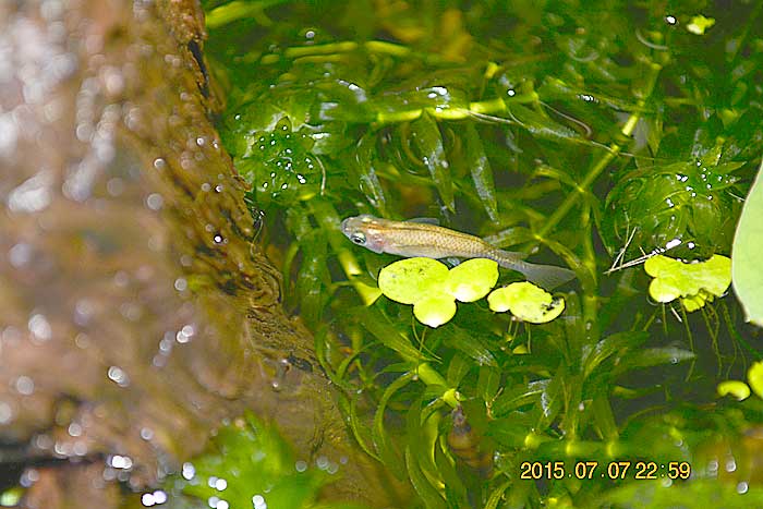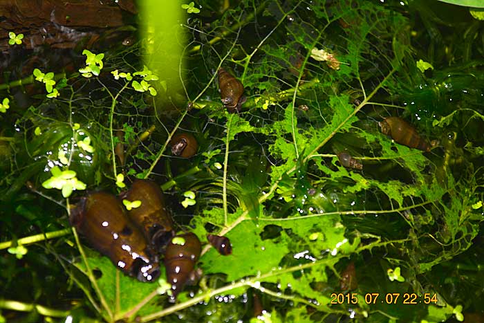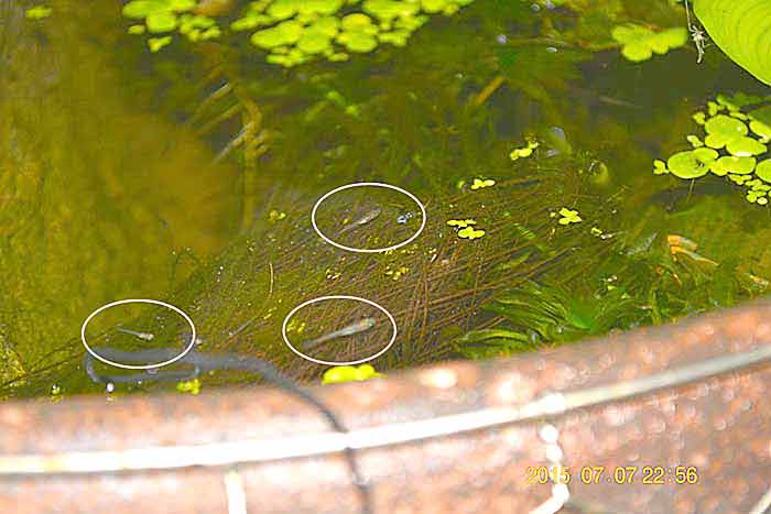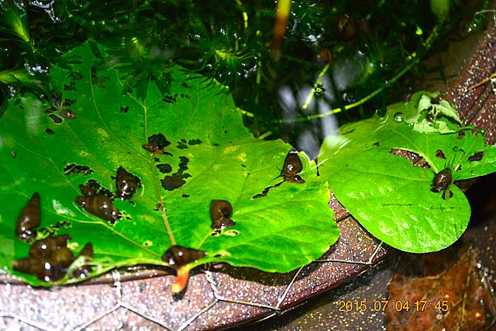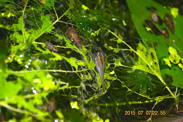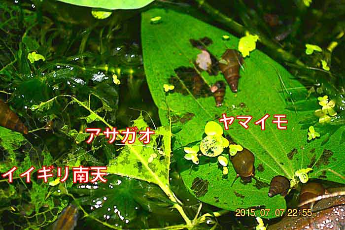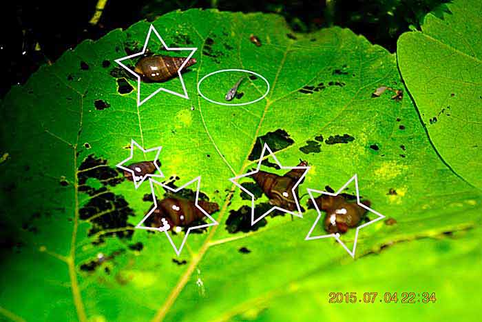 | ☆内は、蜷。美味しそうにイイギリ南天の葉を食べている。○内は子メダカ |