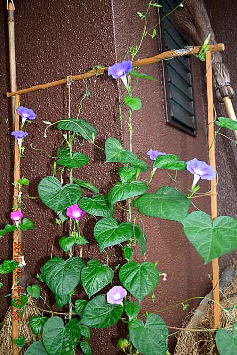 4)アサガオは他にもいろんな種類を植えているが、順番に咲き始めている〜