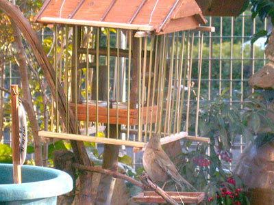 メジロがお腹を空かせないように,食に来たときいつも食べれるようにケージを作った。それで大きな鳥はそこの食事は食べれない。茶色の大きな鳥が一生懸命中に入れないかと入口を捜している様子が伺える〜