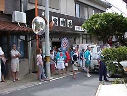 木屋前-最近まで豆腐屋であり民宿だった。 振舞いの天ぷら、おいしかった! 海水浴客も見学-ヘソピアスの女の子 岩城や民宿、振舞いおにぎり