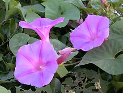 太陽はもう見えていなかった。梅の屋というむかしからある食堂の脇に赤紫色をした大きな朝顔が数十個咲き乱れていた。朝顔?夕方にこんな時間にきれいに咲いているのは朝顔なんだろうか?夕顔って白い花のはずだが、、、デジカメの写真をよく見ると、葉っぱの形が覚えのある朝顔と違っているようである。