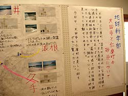 鳴り砂コーナーは、地球科学部がやっていた。手作りの作品がついたてやテーブルに並べられ、数人の学生が5,6個ある乳鉢に入った砂を突いていた。掲示板には、大田市と仁摩町の地図が張られていて、砂浜の写真と調査した様子が記録されていた。さらに砂の粒度分布を測定し、篩の格段に溜まった砂の実物も貼り付けてあった。砂鉄の多い浜は、一番細かい領域に集