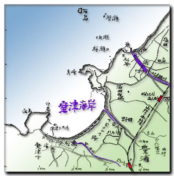 室津海岸は、JR山陰本線から離れたところに在り、車窓からは見えない(左図)。この形は、琴ヶ浜と良く似ているのが、不思議なくらいである。