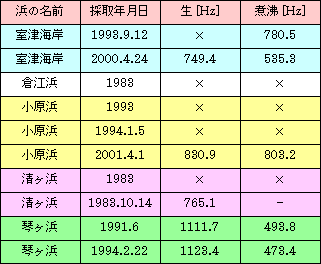 砂の発音特性をしらべてみた。室津海岸の砂は、二種類送られてきて、そのままの状態と煮沸洗浄した時の音をしらべてみた。その結果を、以下の表にまとめた。送られてきたそのままの93年の砂は、ほとんど音を発しなかったが、94年に採取された砂は、好い発音特性を示した。煮沸洗浄してみると、いずれも回復してきたが、93年の砂は、やはり回復率(?)は良くないようである。2000年4月24日の砂は、そのままでも鳴り砂の特徴を示し、洗浄すると更に感度の好い鳴り砂になっている。