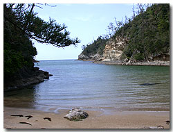 やはり砂は洗浄されていなく,粘土質に近い砂である.それは周囲を見ればそのことは簡単に理解できた.今にも壊れそうな絶壁があちこちに顔を覗かせている.その風化したものがどんどんと堆積しているのである.当然鳴り砂ではない.更に,奥まった地形の浜であり,きっと大荒れの海になったところで,浜までは大波は押し寄せてこないであろうと思われるほど長細い.それだからこそ,むかしの小さな舟は荒れたときには治まるまで停泊し行動することで安全に出入り出来たのであろう.